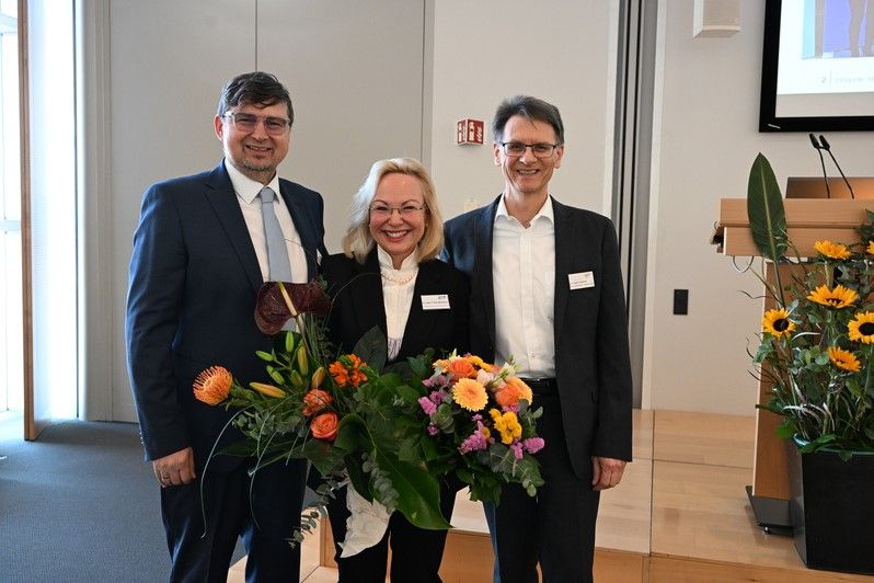 Mit Standing Ovations gratulierte die Vertreterversammlung der Kassenärztlichen Vereinigung Bayerns der VV-Vorsitzenden Dr. Petra Reis-Berkowicz zur „Bayerischen Staatsmedaille für Verdienste um Gesundheit, Pflege und Prävention“. Bayerns Staatsministerin für Gesundheit, Pflege und Prävention, Judith Gerlach, hatte der engagierten Hausärztin und stellvertretenden Vorsitzenden des Bayerischen Hausärzteverbandes vor wenigen Tagen die Auszeichnung verliehen (wir berichteten). Dr. Christan Pfeiffer, Vorstandsvorsitzender der Kassenärztlichen Vereinigung Bayerns, und Dr. Wolfgang Ritter, Landesvorsitzender des Bayerischen Hausärzteverbandes, überreichten Blumensträuße.