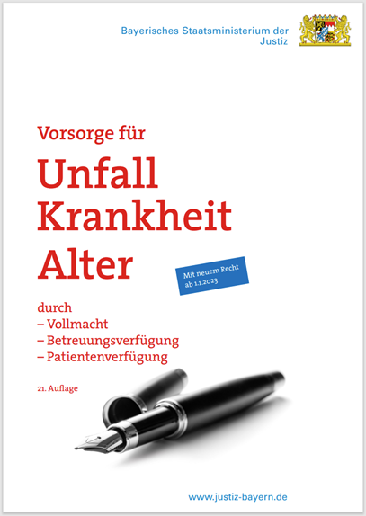 Das Justizministerium stellt Broschüren zum Download und Flyer zur Auslage in Ihrer Praxis kostenfrei zur Verfügung. Die Informationen dazu und zu den Themen Vorsorgevollmacht, Betreuungsverfügung, Patientenverfügung finden Sie in der Veröffentlichung des Justizministers.