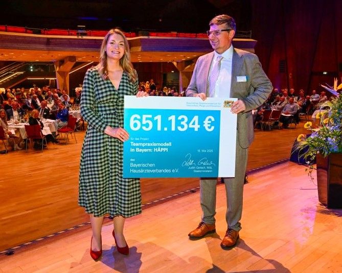 Zwei Tage volles Programm: Beim 32. Bayerischen Hausärztetag 2025 vom 16. bis 17. Mai in Erlangen gab es Fortbildungen fürs ganze Praxisteam, Berufspolitik und viele Möglichkeiten zum Netzwerken. Zu den besonderen Highlights gehörte die Übergabe des Förderbescheids durch die bayerische Gesundheitsministerin Judith Gerlach für die Erprobung des Teampraxis-Modells HÄPPI.