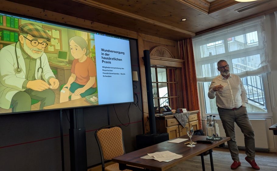 In netter und ungezwungener Atmosphäre fanden sich am vergangenen Mittwoch bei der Bezirksmitgliederversammlung Schwaben im Hotel Hirsch in Finningen (Neu-Ulm) hausärztliche Kolleginnen und Kollegen zusammen, um sich über die aktuellen Themen für die Hausärzteschaft auszutauschen. Dieser typische Charakter der Bezirksmitgliederversammlung wurde durch ein besonderes Event an diesem Tag ergänzt: In einer Fortbildung zum Thema „Chronische Wundversorgung in der hausärztlichen Praxis“ referierte Dr. Stefan Thamasett in einem lebendigen und sehr interessanten Vortrag unter anderem über die phasengerechte Versorgung chronischer Wunden und über die Zusammenarbeit aller beteiligter Berufsgruppen.