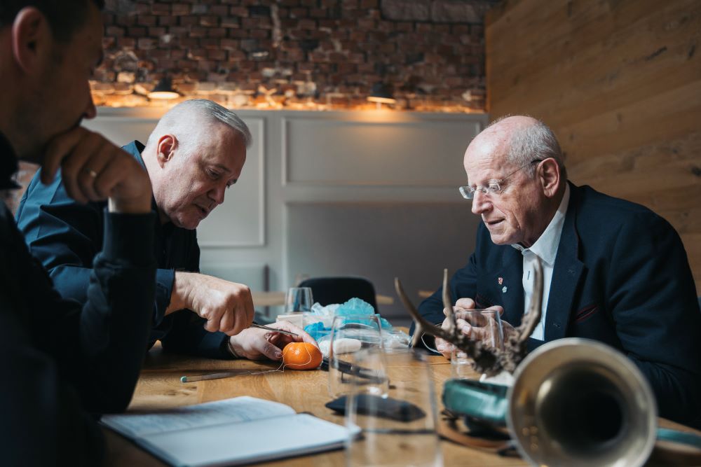 Mit Alexander Herrmann, der bekennender Hausarzt-Fan ist, kam Dr. Böhm über sein Hobby schnell ins Gespräch: Der passionierte Jäger hatte sein Jagdhorn und ein Geweih zum Treffen mit dem Sternekoch mitgebracht – neben seinem chirurgischen Besteck. Für beides ließ sich Herrmann begeistern und bestand nach dem Fachsimpeln über die Zubereitung von Wild darauf, mit der original chirurgischen Ausstattung das Vernähen von Wunden zu erlernen. Als Übungsobjekt diente dabei eine Mandarine.