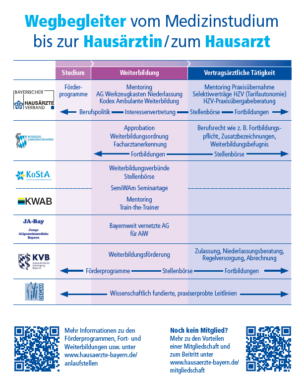 Auf dem Weg vom Medizinstudium bis zur Niederlassung als Hausärztin/Hausarzt werden euch immer wieder Fragestellungen begegnen, für die Ihr kompetente Ansprechpartner braucht. Die wichtigsten in Bayern wollen wir euch hier vorstellen.